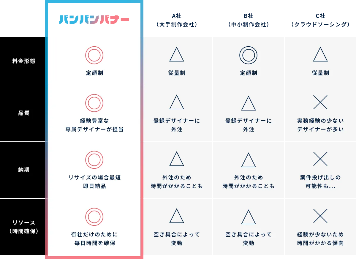 バンバンバナーは、お問い合わせや購入といったCVに繋げることに特化した「セールスデザイン」を得意としております。