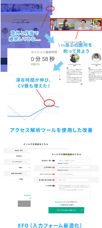 またターゲットがストレスなく目的にたどり着けるようにUI/UXの改善や、お問い合わせや購入といったCV(成果)に直結する入力フォーム最適化、ページスピードの改善等、